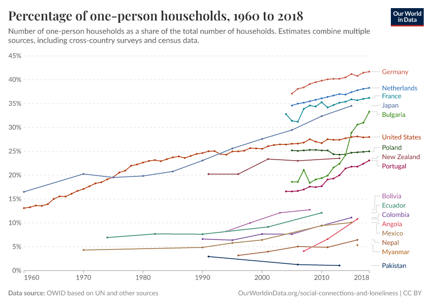 In the US, the share of adults who live alone nearly doubled over the last 50 years. This is not only happening in the US: single-person households have become increasingly common in many countries across the world, from Angola to Japan.