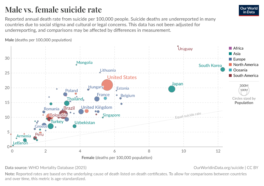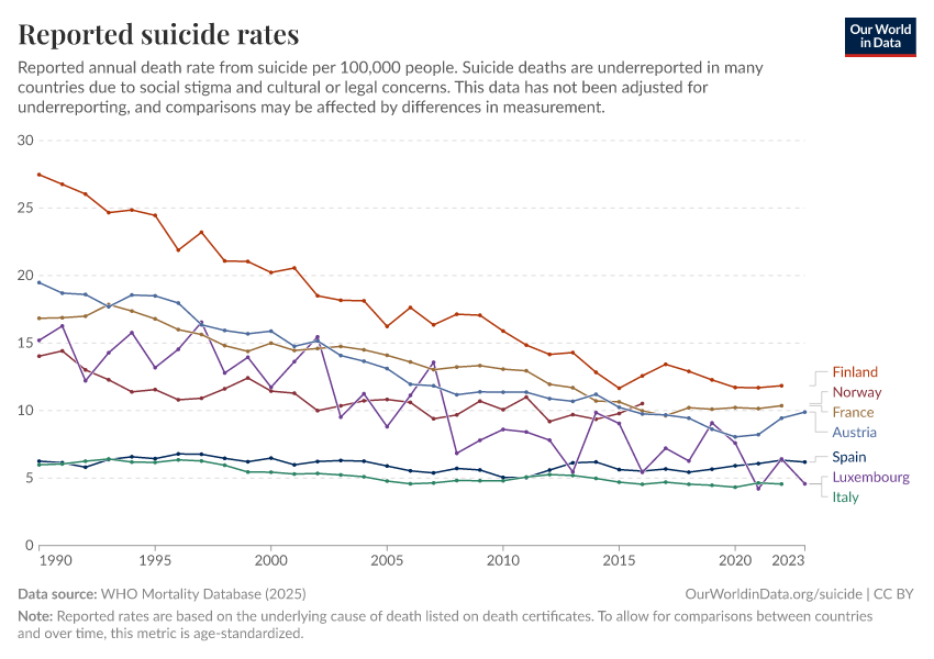 Saloni Dattani, Lucas Rodés-Guirao, Hannah Ritchie, Max Roser, and Esteban Ortiz-Ospina (2023) - “Suicides” Published online at OurWorldinData.org. Retrieved from: 'https://search-refactor-react-query.owid.pages.dev/suicide' [Online Resource]BibTeX citation