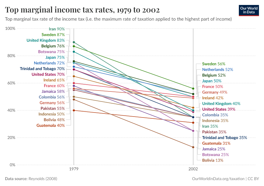 As we can see, at the turn of the 20th century the top earners in these countries faced almost zero taxation on the last part of their incomes; but this changed drastically around 1910-1930, when high top marginal rates were introduced. Interestingly, however, this lasted only until about 1980, when again all countries substantially reduced rates. Today the levels are about half of what they used to be at the highest point.