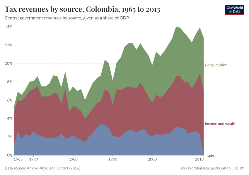 The visualization, using data from Arroyo-Abad and Lindert (2016)6, shows the composition of tax revenues for Colombia. These estimates correspond to central government revenues and are expressed as a share of national income – specifically GDP. Comparable data, from the same source, is also available for Peru; you can see the corresponding figures by clicking on ‘Edit countries' and selecting Peru.