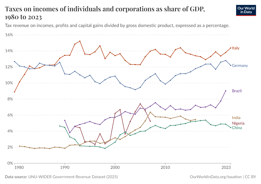 The next visualization provides an overview of revenues from income taxation (specifically taxes on incomes, profits, and capital gains) over recent decades. The estimates correspond to direct taxation of individuals and corporations and are expressed as a share of GDP.