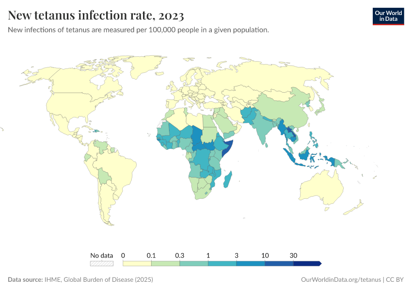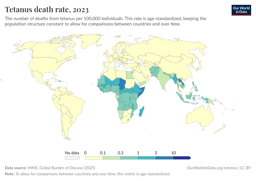 Hannah Behrens, Sophie Ochmann, Bernadeta Dadonaite, and Max Roser (2019) - “Tetanus” Published online at OurWorldinData.org. Retrieved from: 'https://search-refactor-react-query.owid.pages.dev/tetanus' [Online Resource]BibTeX citation