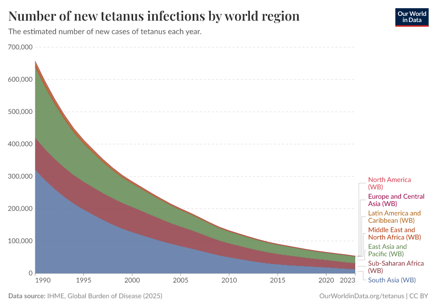 However, even though South Asia still sees more cases of tetanus than any other region, in just three decades the number of new infections has fallen massively, from close to 400,000 infections in 1990 to around 30,000 in 2019.