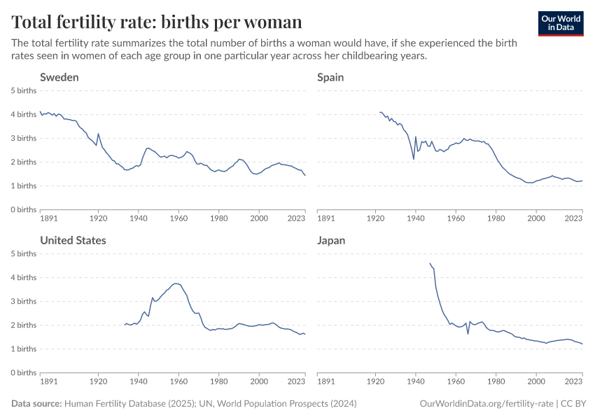 Saloni Dattani and Lucas Rodés-Guirao (2025) - “Why the total fertility rate doesn’t necessarily tell us the number of births women eventually have” Published online at OurWorldinData.org. Retrieved from: 'https://search-refactor-react-query.owid.pages.dev/total-fertility-rate-births-per-woman' [Online Resource]BibTeX citation