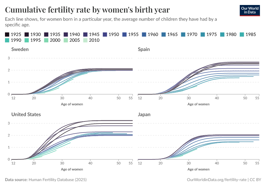 Now you can see that in Sweden, although the curves are pushed towards the right (meaning that childbirths have been delayed), eventually, each cohort reached a cumulative fertility rate of 2 births per woman. This reflects a tempo effect but not a quantum effect.