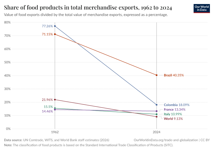The next visualization plots the share of food exports in each country's total exported merchandise. These figures, produced by the World Bank, correspond to the Standard International Trade Classification, in which 'food' includes, among other goods, live animals, beverages, tobacco, coffee, oils, and fats.