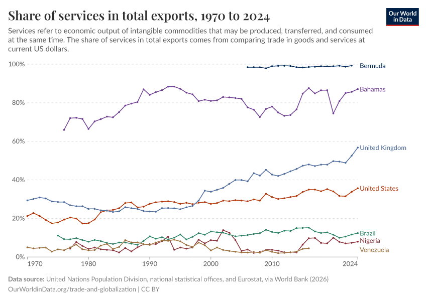 In some countries services are today an important driver of trade: in the UK services account for around half of all exports; and in the Bahamas, almost all exports are services.