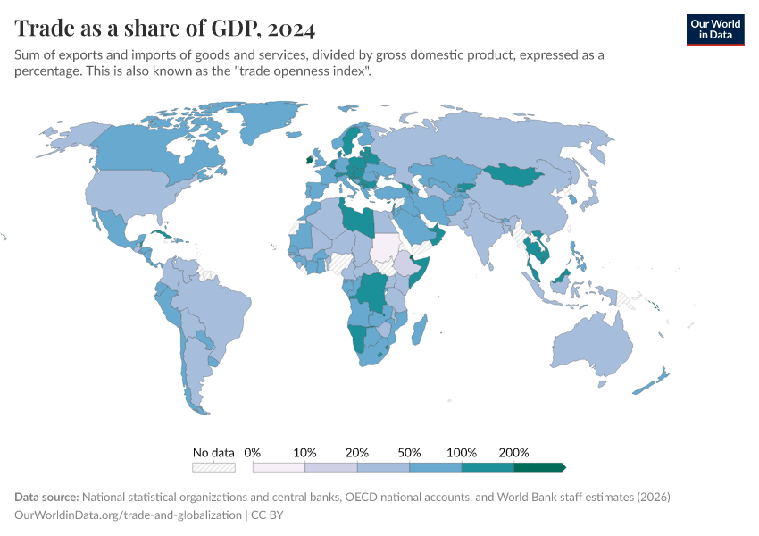 If you press the play button on the map, you can see changes over time. This reveals that, despite the great variation between countries, there is a common trend: over the last couple of decades trade openness has gone up in most countries.