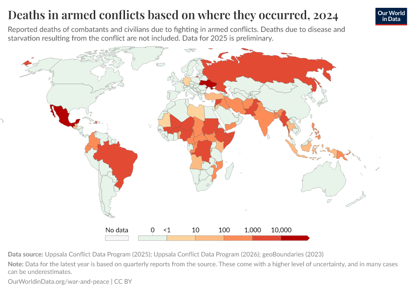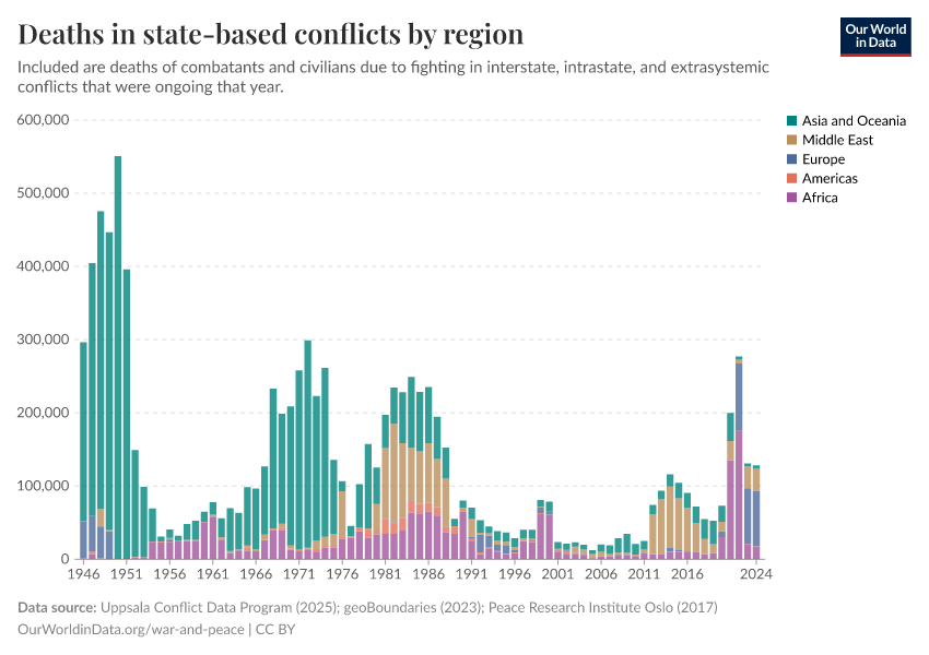 Bastian Herre, Lucas Rodés-Guirao, and Max Roser (2024) - “War and Peace” Published online at OurWorldinData.org. Retrieved from: 'https://search-refactor-react-query.owid.pages.dev/war-and-peace' [Online Resource]BibTeX citation