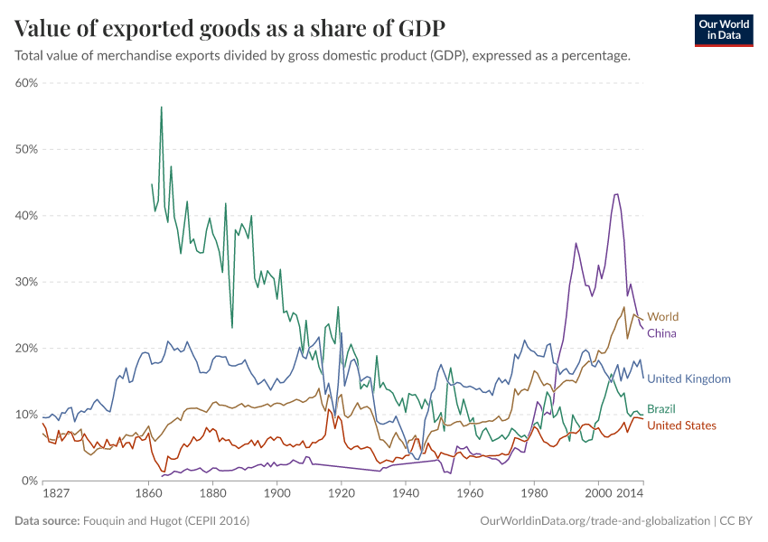 One of the key additions to the topic page are new charts exploring long-run trade estimates across countries and world regions. Here is an example: merchandise export-to-GDP ratios from 1827 up until 2014.